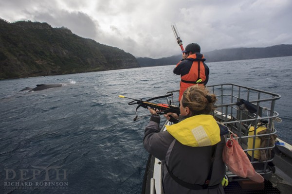 The team deployed a satellite tag on a mother with a calf despite the squally conditions. Photograph Richard Robinson © 2015.