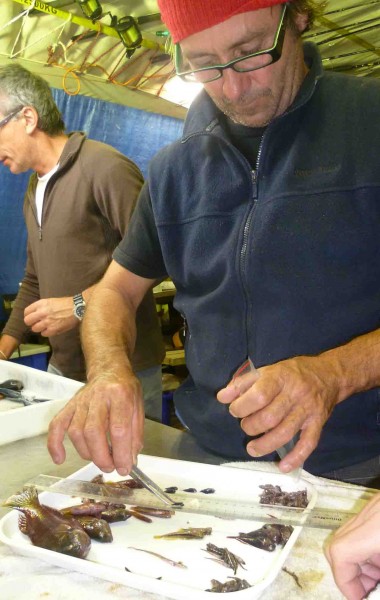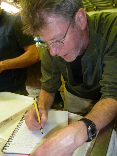 First in line is Mark, who is chief note-taker. He keeps a ledger with all the details such as station number, lot number, fish names, and the number of specimens going to each of the three participating museums (Auckland Museum, Te Papa, and the Australian Museum). Later in the evening all this information is transferred to computer.