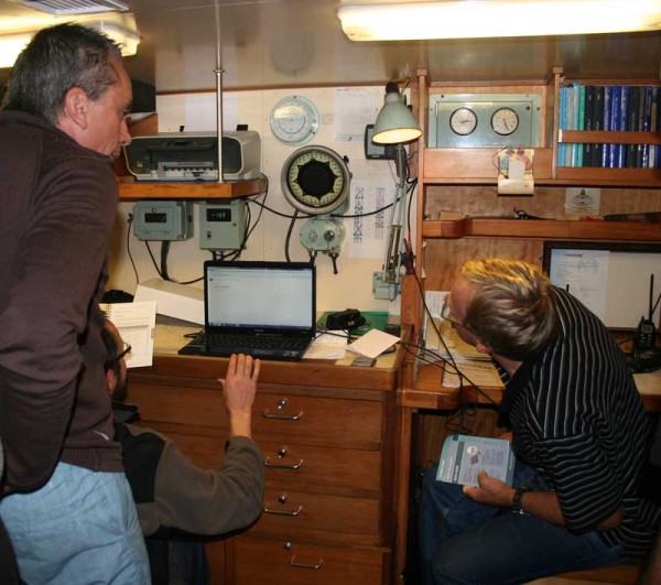 Tom and the team configuring the laptop for sending daily blog posts from the Braveheart