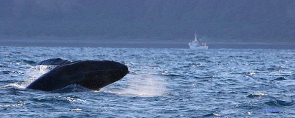 Today we have encountered a mother and her calf breaching simultaneously, while others, displaying courtship behaviour, stayed submerged for long periods. When our last whale today lifted up their tail flukes to dive, we saw lots of little black lines on it … A note of interest for some of the little people following our voyage (Hello Matisse and Aramis!), many of the whales we have encountered have evidence of killer whale attacks on their fins and backs. These can be identified by teeth marks which form lines that look like a rake has scraped it. Humpback whales scar white on their black pigment and scar black on their white pigment, thus the scars from the bite marks stand out distinctively.
